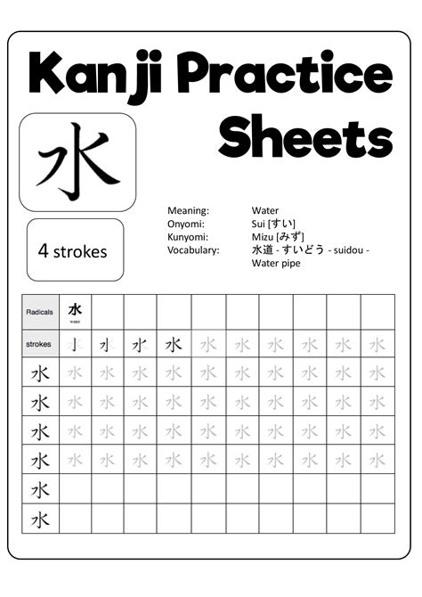Printable Kanji Practice Sheets. This is the first in a series of free kanji writing practice sheets that you can download and print. Practice sheets are printouts that show you how to write the hiragana,.