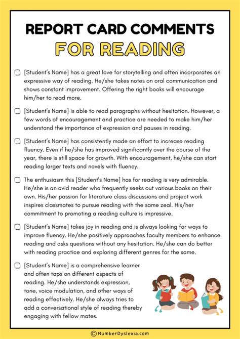 Reading Comments For Report Cards. Following you will find a variety of language arts and reading report card comment examples. Works to the fullest of his/her abilities.